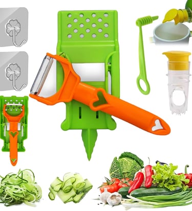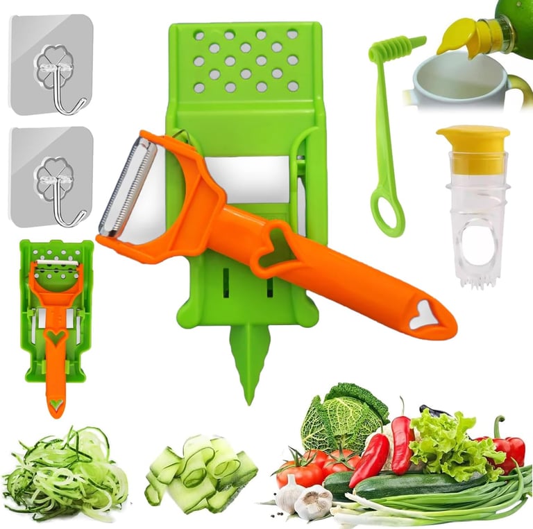 Upgrade your daily food prep with this 2-in-1 multifunction vegetable peeler. Designed with ultra-sharp stainless-steel blades, it peels, juliennes, and spiralizes vegetables effortlessly while staying safe and comfortable to use. The ergonomic non-slip handle ensures full control, even with wet hands, and the added lemon squeezer makes it a true all-in-one kitchen helper. Lightweight, practical, and easy to clean, this tool saves time and brings creativity to every meal.