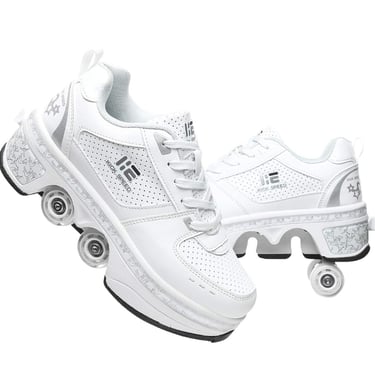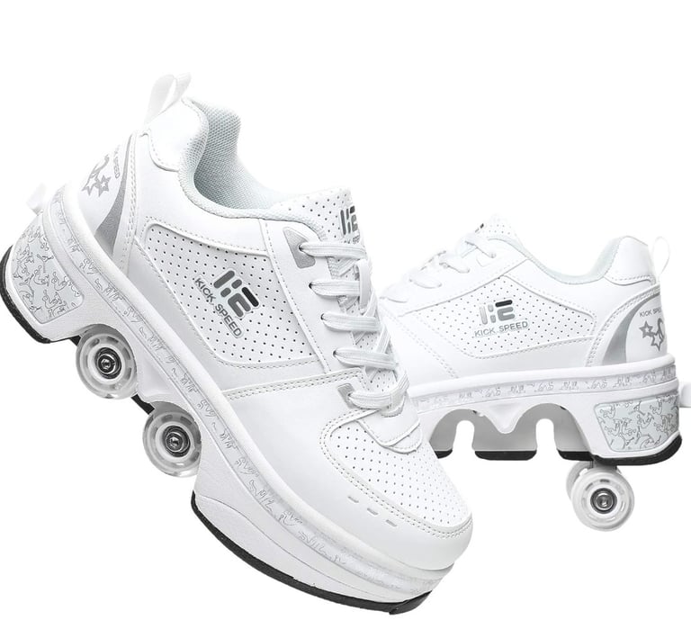 These stylish 2-in-1 roller skate shoes offer a perfect combination of casual footwear and skating fun. With retractable wheels hidden in the sole, you can easily switch from walking to skating in seconds. Designed for safety and everyday wear, they feature a secure fit, breathable materials, and eye-catching design. Great for outdoor adventures, skating practice, or just rolling around in style.