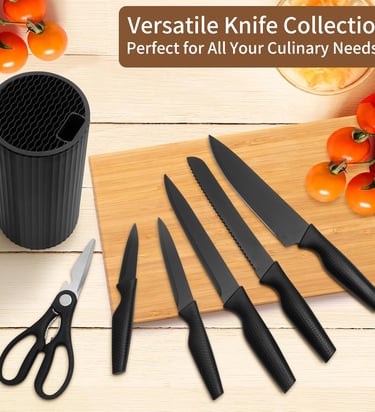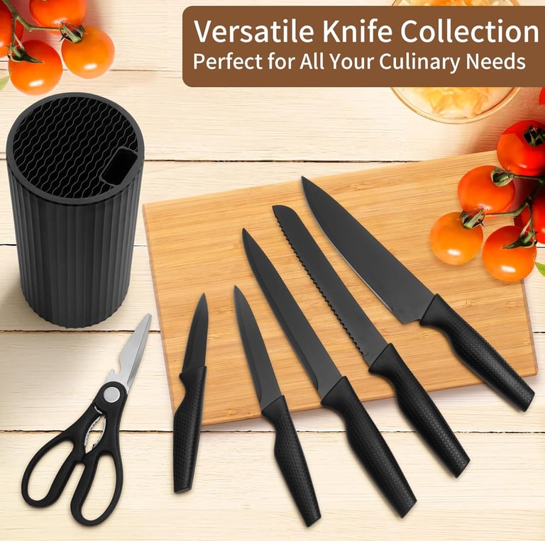 Upgrade your kitchen prep with this 7-Piece Black Kitchen Knife Set with Block — a complete collection built for everyday cutting, slicing, and chopping. Each knife features sharp, durable stainless steel blades with a non-stick coating that helps prevent food from sticking, while the ergonomic, non-slip handles provide safety and control even when wet. With versatile knives from bread to chef to paring, plus included scissors and a space-saving storage block, this set brings professional-style performance to home cooking in a sleek black design that looks great on any countertop.