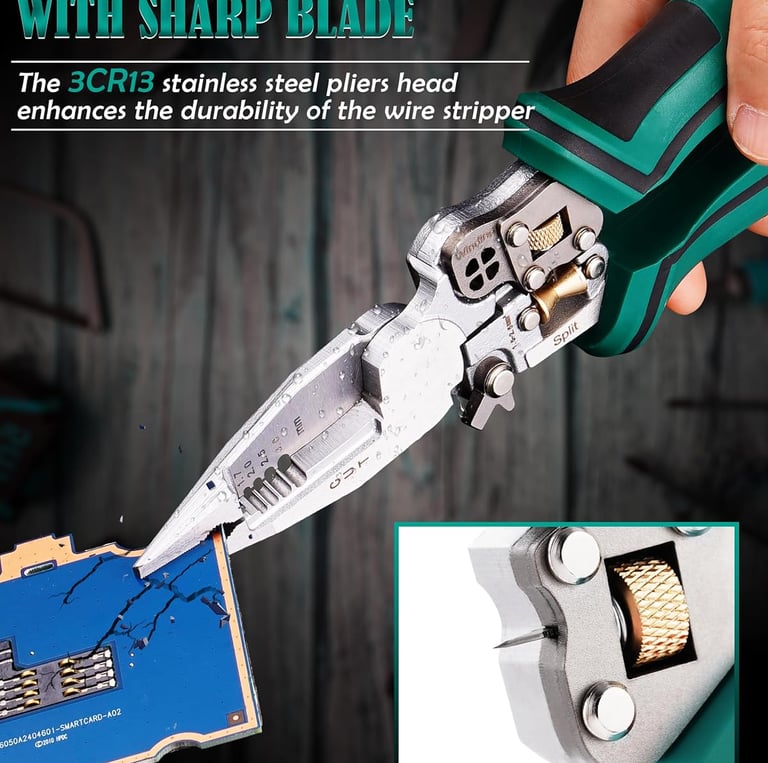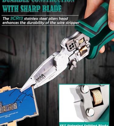 Upgrade your toolbox with this versatile 8-in-1 wire stripper designed for electricians and DIY users. Built from durable stainless steel, it strips, cuts, crimps, splits, twists wires, and even includes a built-in voltage indicator. Compatible with 10-18 AWG sizes, it delivers clean cuts and precise stripping without damaging conductors. Compact yet powerful, this all-in-one tool reduces clutter and boosts efficiency for home repairs or professional electrical work.