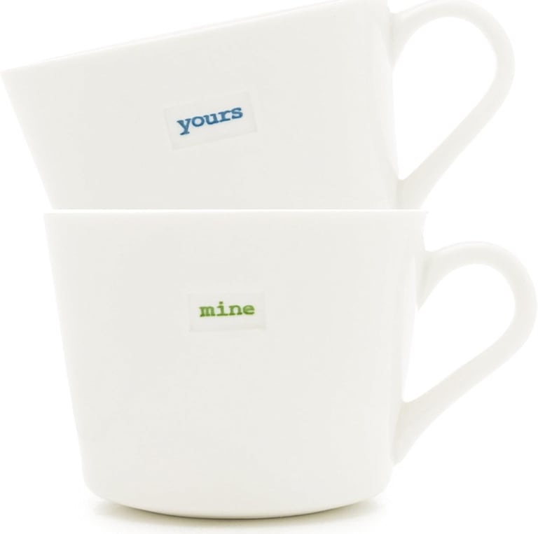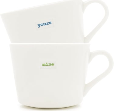 This charming Keith Brymer Jones mini mug pair (“Yours” & “Mine”) brings playful elegance to your coffee routine. Crafted from super-white porcelain and hand-finished, each holds about 9.4 fl oz and is safe for the dishwasher and microwave. A perfect gift for couples or a cute addition to your mug collection.
