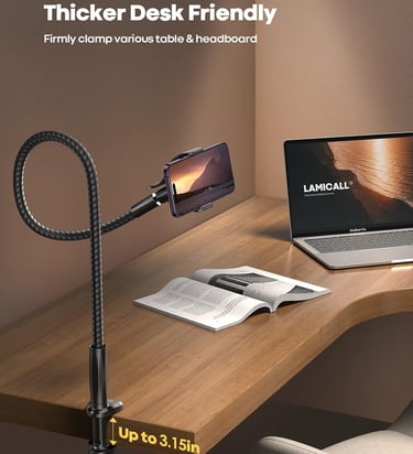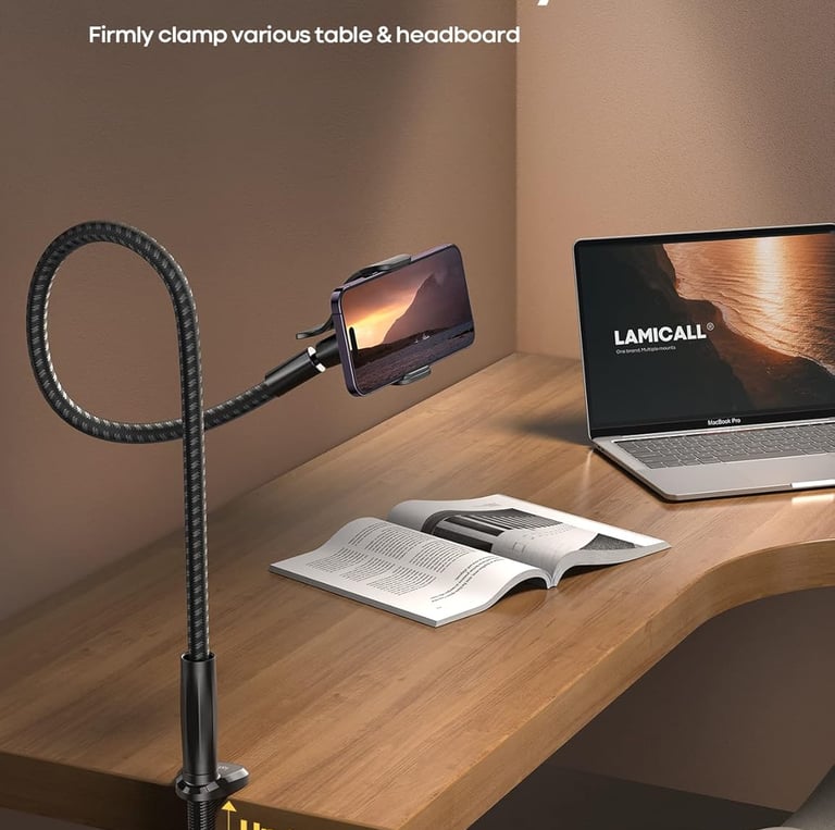 Enjoy hands-free viewing anywhere with the Lamicall Flexible Gooseneck Phone Holder Stand. Its long 38-inch nylon-braided flexible arm lets you position your phone at the perfect angle for watching videos, video calling, reading, or following recipes — no neck strain required. The sturdy clamp base secures to your bed frame, desk, nightstand, or table edge, while the 360° adjustable phone clip accommodates most 4–7″ smartphones. A must-have for comfortable, effortless viewing at home or work.