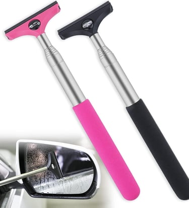 Retractable car mirror squeegee for fast, safe, streak-free visibility.