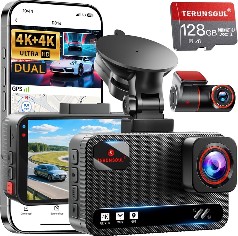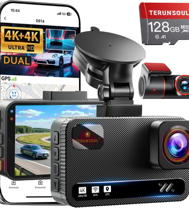Capture every moment on the road with the TERUNSOUl 4K+4K Dash Cam. This dual-channel system records front and rear in 4K, delivering crystal-clear footage day and night thanks to super starlight night vision and wide 170° lenses. It includes a free 128GB card, supports up to 512GB, and features built-in GPS, 5.8GHz WiFi, and app control for easy video download and sharing. With G-sensor auto-lock, loop recording, and 24H parking mode, it protects your vehicle 24/7. Simple install, premium build, and real peace of mind on every drive.