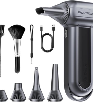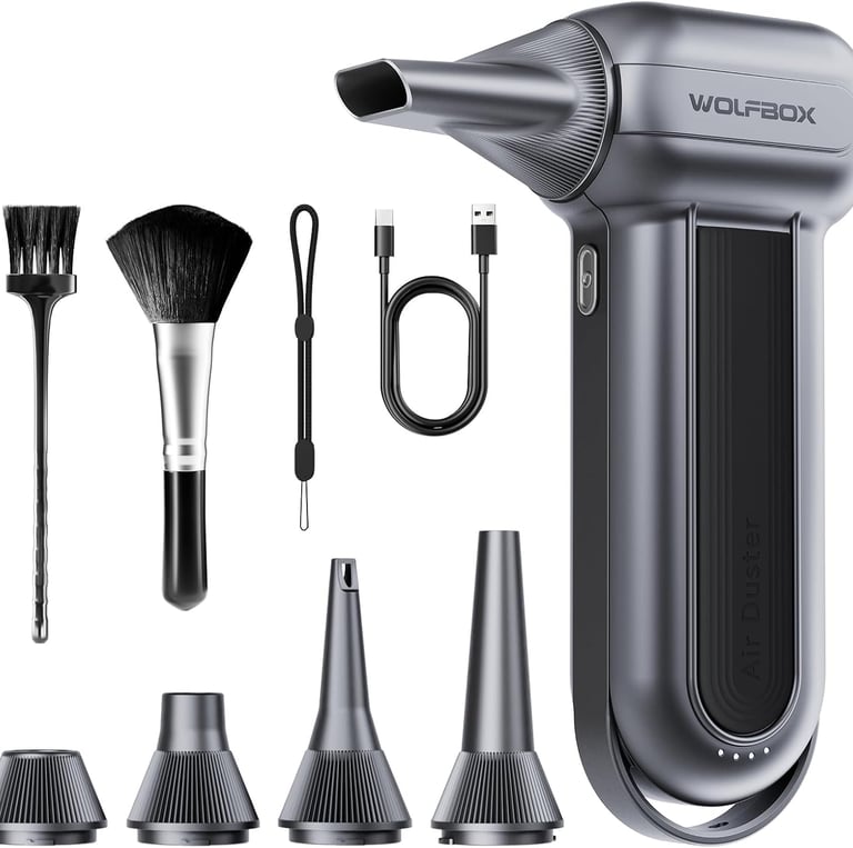 Blast dust and debris effortlessly with the WOLFBOX MF100. Its 150,000 RPM brushless motor delivers powerful air for cleaning keyboards, PCs, cars, and outdoor areas. Lightweight and rechargeable, it offers 3 adjustable speeds, multiple nozzles, and long battery life for repeated use. Compact, portable, and eco-friendly, this duster replaces single-use air cans while keeping electronics safe and spotless. Perfect for home, office, or travel.